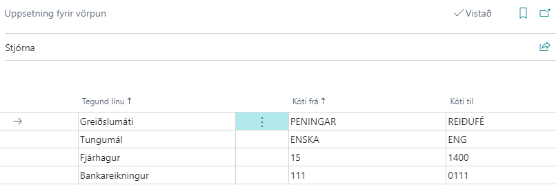 Hér er valin tegund sem á að varpa, þ.e. Greiðslumáti, Tungumál, Fjárhagur eða Bankareikningur. | Kótinn sem færslurnar koma með frá Godo hótelkerfinu. | Hér kemur felligluggi þar sem hægt er að velja gildi í BC sem á að varpa á gildinu frá Godo hótelkerfinu á. Ef valinn er, sem dæmi, tegund línu Greiðslumáti kemur hér upp listi yfir alla greiðslumáta í BC og valinn er viðeigandi greiðslumáti sem á að varpa á móti gildinu sem sett var inn í Kóti frá. |