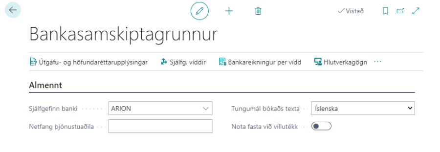 Sjálfgefinn banki | Hér skal skrá þann banka sem er aðalviðskiptabankinn, þá kemur hann sjálfkrafa upp í ýmsum aðgerðum. Hægt er að breyta í aðra viðskiptabanka eftir þörfum. |