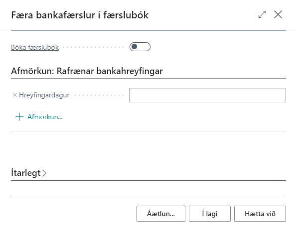 Ef óskað er eftir því að bóka færslubókina sjálfkrafa er sett hak í reitinn Bóka færslubók. Þegar búið er að sækja þekktar færslur og flytja í færslubók merkir kerfið færslurnar í töflunni svo það er ekki hætta á því að sömu færslur verði sóttar aftur og fluttar í færslubókina. Keyrslan er keyrð eins oft og þörf er á.
