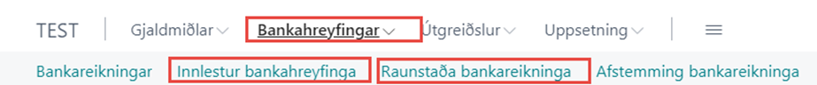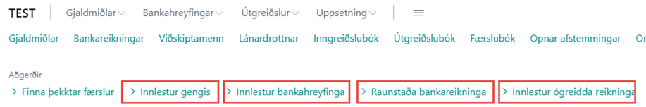 Innlestur bankahreyfinga, raunstöðu bankareikninga, gengis og ógreiddra reikningar er aðgengilegur undir Aðgerðir í hlutverki Bankasamskiptakerfis.