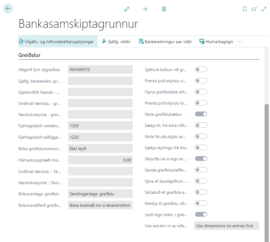 Sjálfgefinn bankareikningur greiðslu | Hér er hægt að velja hvaða bankareikningur er sjálfkrafa valinn fyrir útgreiðslu, bæði þegar ný greiðsla er búin til og einnig þegar verið er að greiða. |