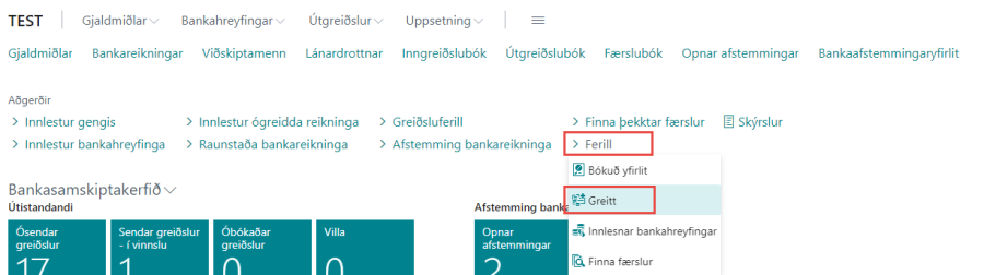 Allar greiðslur sem greiddar hafa verið í gegnum Bankasamskiptakerfið er hægt að sjá undir valmyndarliðnum Ferill og Greitt.