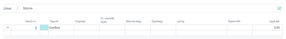 Línur | Neðst á greiðsluspjaldinu eru línur en þar er hægt að velja opnar lánardrottnafærslur sem eru tengdar þeim lánardrottni sem er skráður sem viðtakandi á greiðslunni. ![]() Með því að kafa ofan í dálkinn Færsla nr. opnast yfirlit með öllum opnum lánardrottnafærslum viðkomandi lánardrottna. Þær færslur sem eru grænar á þessum lista eru þegar tengdar greiðslu í greiðsluferlinu. Þegar lánardrottnafærsla er valin myndast viðeigandi greiðslulína fyrir þá lánardrottnafærslu. |