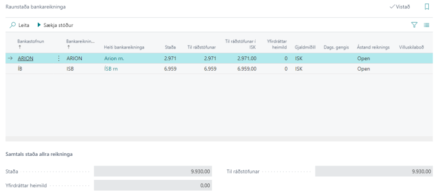 Þessi aðgerð opnar gluggann Raunstaða bankareikninga. Í glugganum er listi yfir alla bankareikninga sem eru uppsettir sem rafrænir reikninga og með virka stöðu í Bankasamskiptakerfinu undir Reikningar bankastofnana.