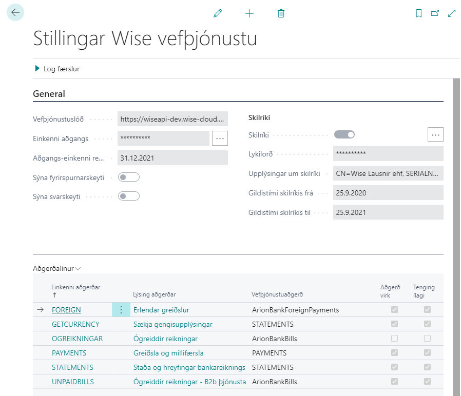 Hér er skilríki fyrirtækisins sett upp ásamt vefþjónustum fyrir hverja aðgerð.