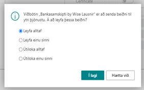 Í reitinn Einkenni aðgangs þarf að setja aðgangslykil sem Wise útvegar. Þegar nýr lykill er skráður inn í reitinn tengist kerfið sjálfkrafa inn á vefþjónustuna sem er tilgreind í reitnum Vefþjónustuslóð og opnast þá þessi gluggi þar sem hakað er í Leyfa alltaf: