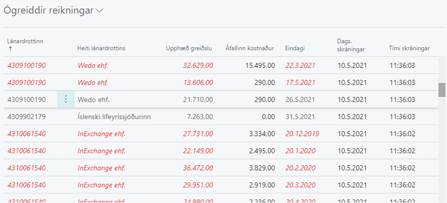 Ef verið er að notast við innlestur á kröfupotti/ógreiddum reikningum birtast þeir neðan við upplýsingarkassana. Athugið að þetta er ekki sýnilegt nema B2b viðbót Bankasamskiptakerfisins sé uppsett.