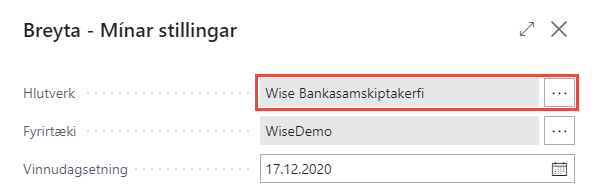 Í hlutverki Bankasamskiptakerfisins eru allar aðgerðir kerfisins ásamt tengdum aðgerðum aðgengilegar á einum stað. Í þessari handbók er gengið út frá því að hlutverk Bankasamskiptakerfisins sé notað þegar unnið er í kerfinu. Allar aðgerðir eru þó líka aðgengilegar út frá valmynd BC kerfisins og út frá leit. Fyrsta skref er að breyta hlutverkinu í Wise Bankasamskiptakerfi en það er gert undir Mínar stillingar (alt+T):