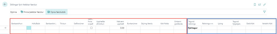 Í reitina í rauða kassanum á myndinni hér fyrir neðan af uppsetningarglugganum eru sett inn gildi sem einkenna þann færsluhóp sem óskað er eftir að kerfið finni í innlesnum bankafærslum. Í reitina í bláa kassanum á myndinni af uppsetningarglugganum eru sett inn gildi sem notuð eru til að mynda línurnar í færslubókinni.