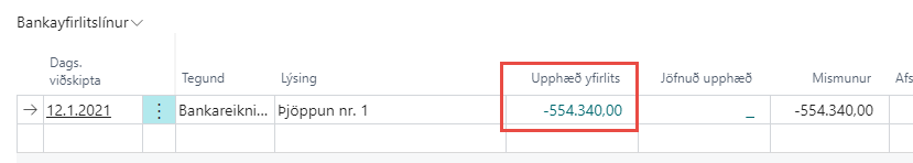 Þegar færsla er ógild með þessu hætti dettur hún út úr yfirlitinu. Smella þarf á Sjálfvirk jöfnun til þess að yfirlitið reikni upp rétta stöðu með tilliti til færslunnar sem var ógild.