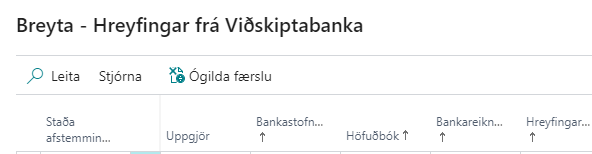 Ef það þarf að ógilda mikið magn af færslum er hægt að gera það út frá glugganum Innlesnar bankafærslur en sú aðgerð er aðgengileg út frá Tengt í afstemmingunni og út frá Ferill í hlutverki banksamskiptakerfisins. Athugið að ef færslur eru ógildar út frá Innlesnar bankafærslur þarf að eyða þeim handvirkt út úr afstemmingarlínunum.