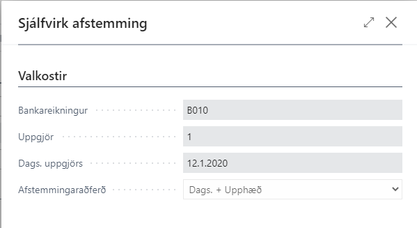 Ef valin er ítarlegri afstemmingaraðferð en Dags. + Upphæð í uppsetningu kerfisins er hægt að byrja á því að keyra afstemmingu með sjálfgefnu aðferðinni en afstemmingin er svo keyrð aftur og er þá afstemmingaraðferðinni breytt í Dags. + Upphæð til þess að stemma af með sjálfvirkni þær færslur sem áttu ekki við ítarlegu afstemmingaraðferðina.