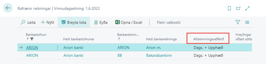 Til þess að breyta um afstemmingarmöguleika er farið í Uppsetning > Stillingar banka > Reikningar banka: