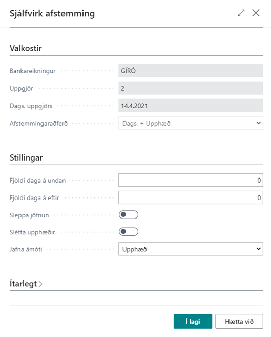 Þegar smellt er á hnappinn Sjálfvirk jöfnun opnast nýr gluggi Sjálfvirk afstemming.