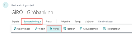 Yfirlitið lokast og færist yfir í bókuð yfirlit. Þau er hægt að skoða beint frá yfirliti Bankareikninga, með því að smella á hnappinn Yfirlit. Einnig er hægt að skoða þau frá Bankareikningsspjaldi með því að smella á samskonar hnapp.
