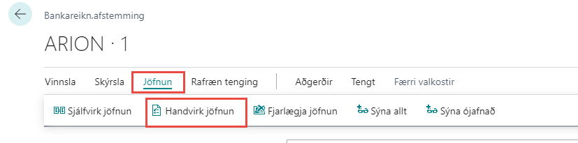 Þegar færslur eru jafnaðar handvirkt þarf að velja þær línur sem á að jafna bæði í bókhaldi og í banka. Að því loknu er smellt á hnappinn Handvirk jöfnun.