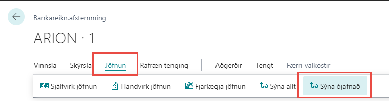 Með því að smella á hnappinn auðveldar það vinnuna þegar verið er að vinna við handjöfnun. Um leið og upphæð hefur verið jöfnuð dettur hún út vegna þessarar afmörkunar og eingöngu er horft á þær línur sem á eftir að jafna. Þegar allar færslur hafa verið jafnaðar er glugginn því tómur. Þá er smellt á hnappinn Sýna allt.