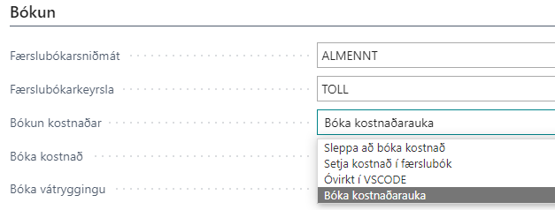 Uppsetning á Bókun flipa í Tollkerfisgrunni stýrir bókun kostnaðar.
