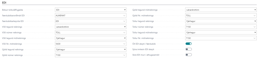 Færslubókarkeyrsla EDI: Hér er valin sú færslubókarkeyrsla sem innlesin EDI gjöld eiga að skrást í.