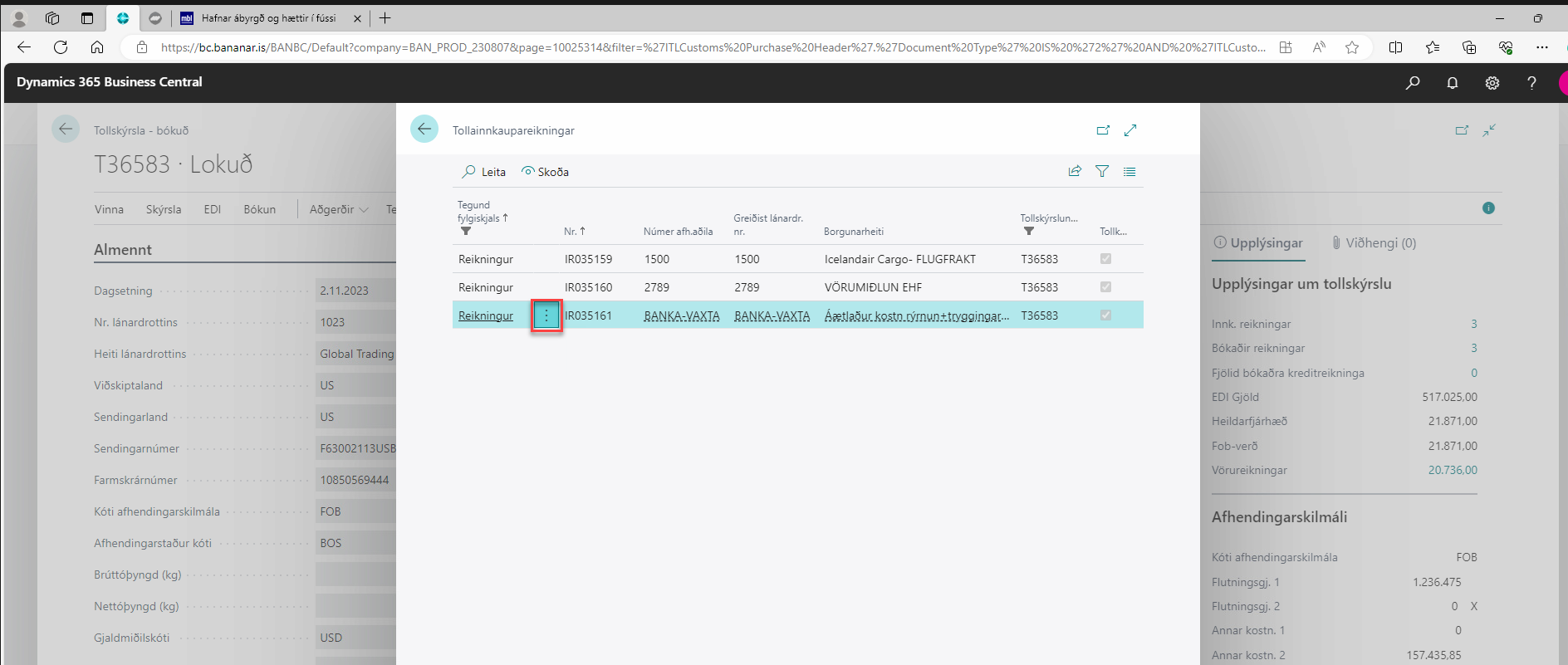 Ef ekki er búið að bóka tollkostnað, þá finna móttökunúmer og fara í bókaða móttöku. Skoða hvort móttaka stemmi við tollskýrslu línur.