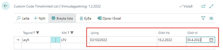 Dálkurinn Lýsing er auður fyrir innslátt á númerum viðkomandi leyfa.