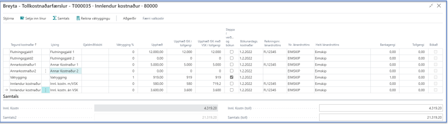 Hér eru settar inn kostnaðarupplýsingar af flutningsgjalda- eða vörureikningi. Til að stemma af upphæðir við reikning er smellt á Samtals ∑ og reiknast þá kostnaður í reitina í samtals flipanum. Hægt er að endurreikna vátryggingu með því að smella á Reikna vátryggingu.
