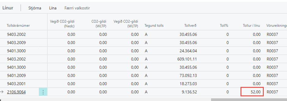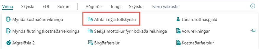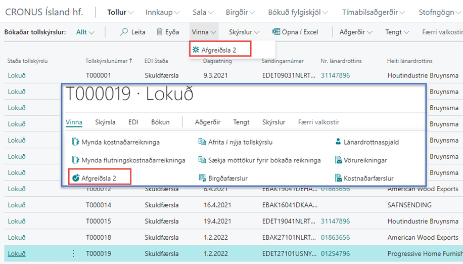 Vantaði EUR skírteini og við viljum fella niður tolla, þá þarf að gera Afgreiðslu 2 og senda leiðréttingu í tollinn. Farið í bókaðar tollskýrslur og veljið Afgreiðsla 2. Aðgerðin er aðgengileg bæði út frá lista og spjaldi.