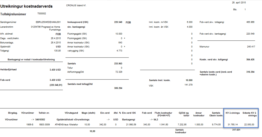 Til að fá inn rétt kostnaðarverð á vöruna með flutningsgjöldum og aðflutningsgjöldum er reiknað kostnaðarverð í tollskýrslunni.