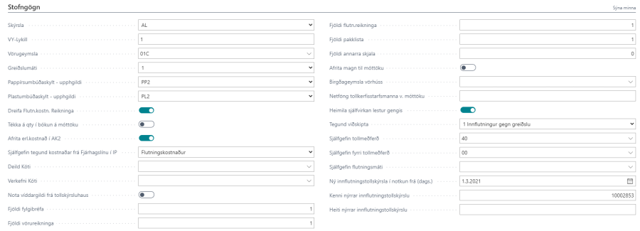Hér eru sett inn gildi sem koma sjálfkrafa í allar tollskýrslur til að spara notanda innslátt í hverja skýrslu. Á myndinni má sjá stillingar eins og almennt eru hafðar.