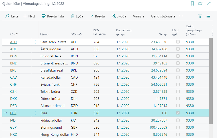 Þá opnast gluggi með öllum gjaldmiðlum skráðum í kerfinu.