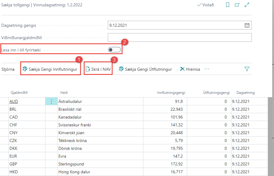 Til að Tollkerfið reikni gjöld og kostnað á sama hátt og Tollstjóri er nauðsynlegt að hafa rétta gengisskráningu í kerfinu.