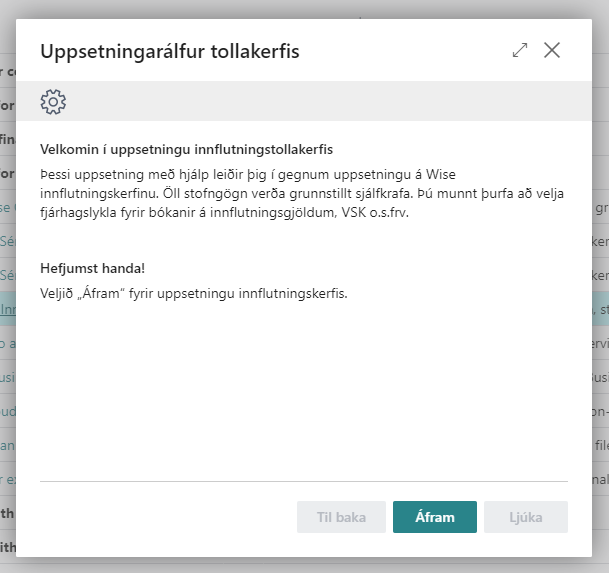 Veljið Setja upp Innflutningskerfi Wise undir flokknum Búðu þig undir viðskipti og fylgið leiðbeiningaraðstoðinni.