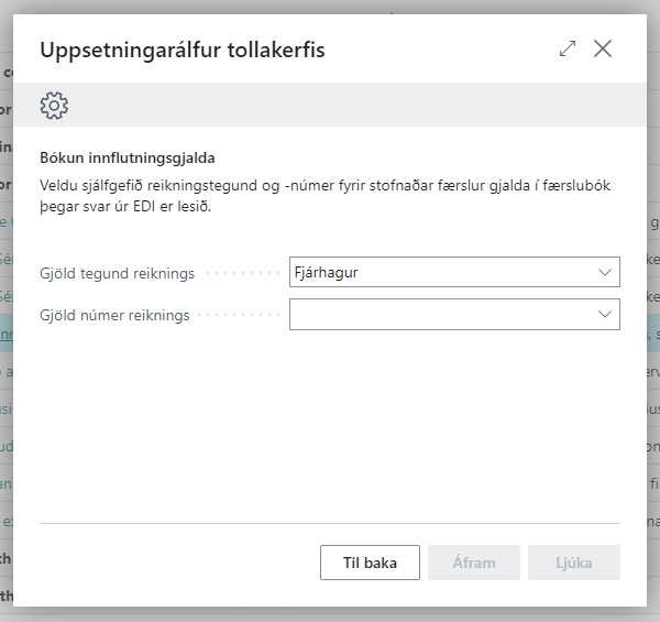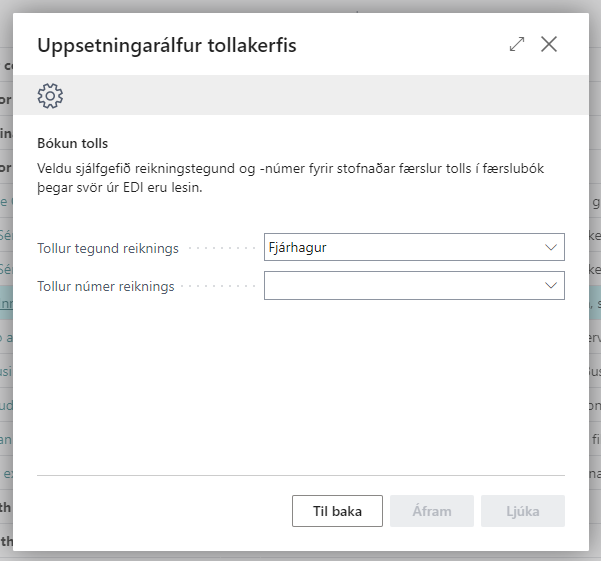 Tollur tegund reiknings | Tilgreinir sjálfgefinn "reiknings tegund tollgjalda" fyrir tollgjalda færslur sem myndast í færslubók við innlestur EDI skuldfærslu svars frá tolli. |