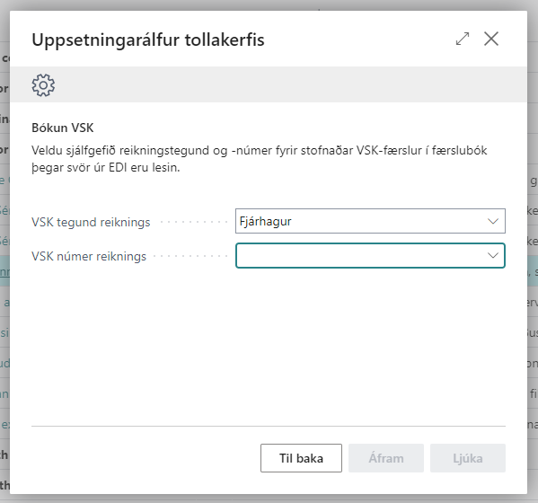 VSK númer reiknings | Tilgreinir sjálfgefið "VSK númer" fyrir VSK færslur sem myndast í færslubók við innlestur EDI skuldfærslu svars frá tolli. |