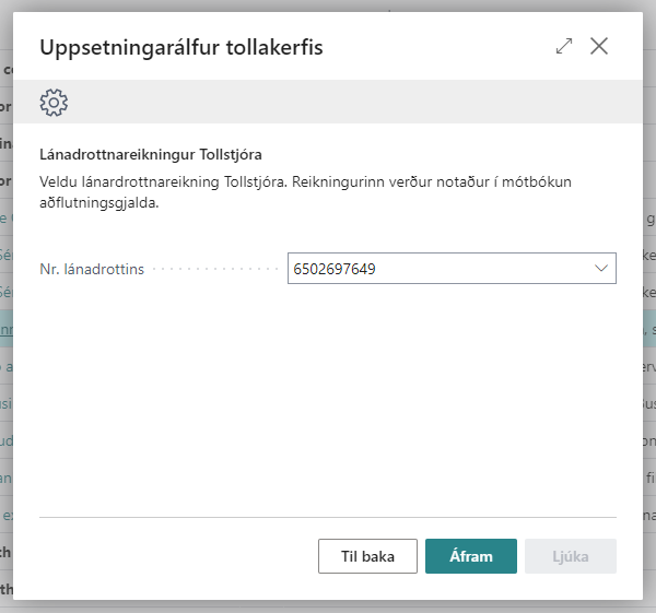 Næst kemur að uppsetningu á Tollstjóra í lánadrottnum. Lánadrottinn verður notaður í mótbókun á aðflutningsgjöldum sem voru sett upp í fyrri skrefum. Þegar fyllt hefur verið út í þennan reiti skal velja Áfram.