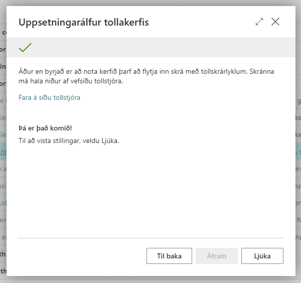 Næst er það lokaskrefið. Hér má finna hlekk á síðu Tollstjóra þar sem sækja má skjöl sem þarf að lesa inn í kerfið að lokinni uppsetningu með hjálp. Síðan mun opnast í nýjum flipa. Að því loknu skal velja Ljúka. Við það eru grunngögn stofnuð og uppsetningu er lokið.
