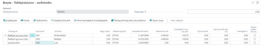 Framlegðar% óbr. söluverð: Hér er reiknuð út framlegð út frá nýju kostnaðarverði m.v. að söluverð haldist óbreytt. Í dæminu hér að ofan má sjá að framlegðin er orðin neikvæð á vörunúmeri 1001 og 1000, þ.e. kostnaðarverð er hærra en söluverðið.