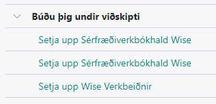Gert er ráð fyrir að uppsetningu á Sérfræðiverkbókhaldi Wise sé lokið áður en hafist er handa við að setja upp Verkbeiðnakerfi Wise. Leiðbeiningar fyrir það má finna hér. Þegar því er lokið er farið í tannhjólið og valið Uppsetning með hjálp.