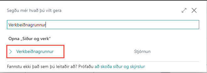 Til að skoða og/eða breyta uppsetningunni skal leita að Verkbeiðnagrunnur í leitarglasinu efst hægra megin og opna síðuna.