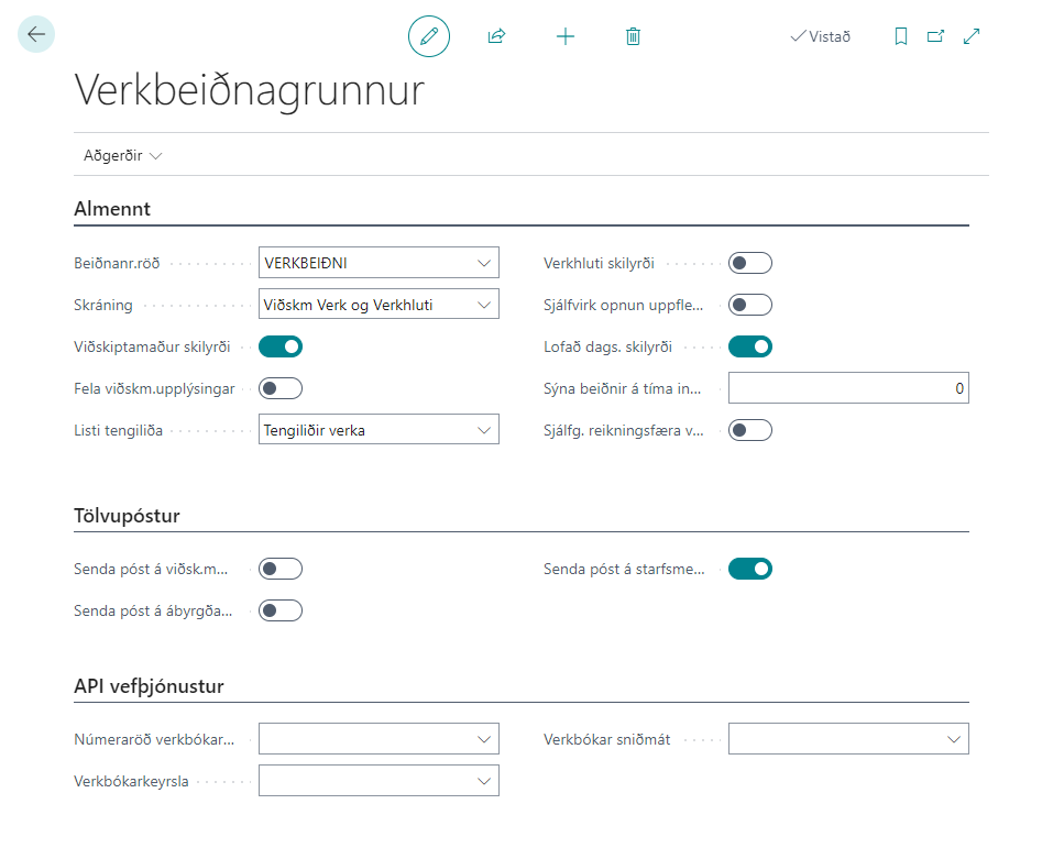 Krafa um verkbeiðni | Tilgreinir sjálfgefið gildi fyrir Krafa um verkbeiðni á verkspjaldi. Ef virkjað munu verkbeiðnir vera skilyrtar í verkbókarlínum og tímaskráningar færslum fyrir valið verk. Þetta er aðeins sjálfgefið gildi og hægt er að breyta á hverju verki. |