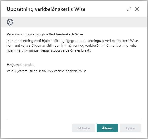 Við það opnast nýr gluggi Uppsetning verkbeiðna. Veljið Áfram.