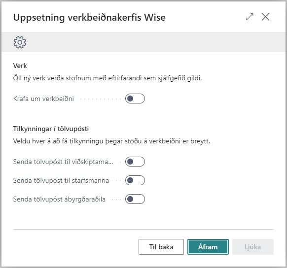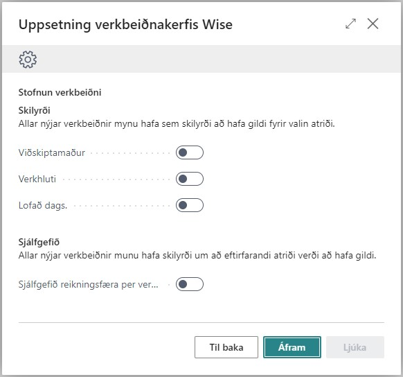 Þegar afstaða hefur verið tekin til þessara stillinga skal velja Áfram. Næst kemur gluggi sem snýr að stofnun á verkbeiðnum.