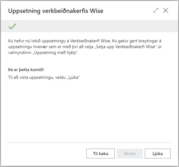 Þegar fyllt hefur verið út í þessa reiti skal velja Áfram og við það verður síðasti hluti uppsetningarinnar sýnilegur. Hér skal velja Ljúka og er uppsetningu á verkagrunni þá lokið.