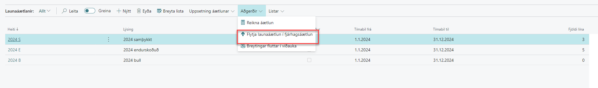 Að öllum breytingum loknum er áætlunin þá aftur flutt í fjárhagsáætlun, en þá yfirskrifast fyrri launaáætlanalínur í fjárhagsáætluninni.