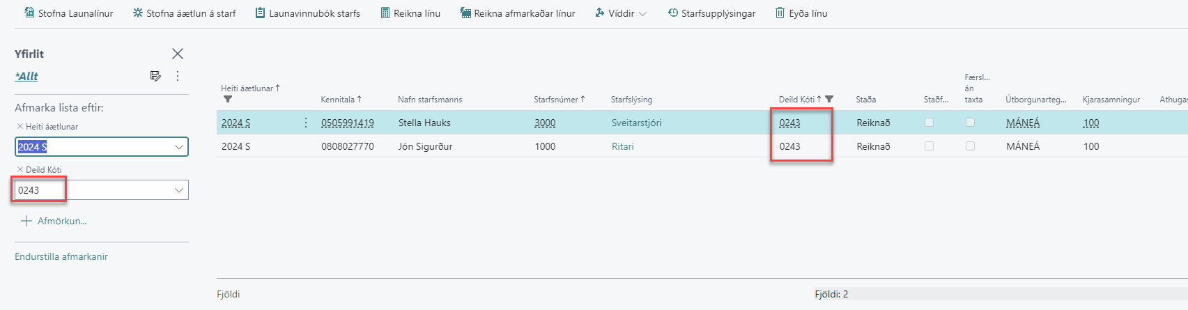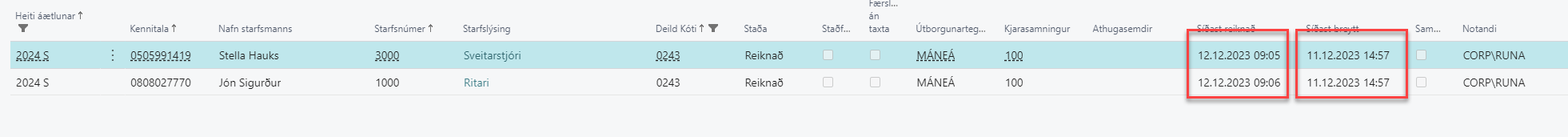 og þaðan er unnið í launavinnubókum starfa sem á að breyta. Passa að gleyma ekki að reikna aftur viðkomandi línur, en kerfið sýnir hvenær línunni var breytt og hvenær hún var síðast reiknuð