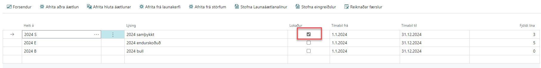 Að seinni umræðu lokinni og launaáætlunin (og fjárhagsáætlunin) skoðast samþykktar í byggðarráði/bæjarstjórn, þá er mikilvægt að setja hak í lokuð. Þá er valið að breyta lista og hakið sett í (muna að velja aftur: breyta lista)