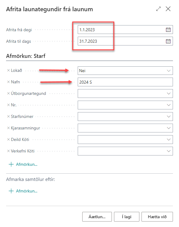 Hægt er að afmarka sig við ýmsa þætti, t.d. kjarasamning deild eða starfsnúmer. Ef engin afmörkun er sett keyrast öll opin störf yfir í áætlunina. Nú er hægt að fara í launavinnubók hvers starfs fyrir sig og byggja upp áætlunina með þeim launaliðum sem á að áætla.