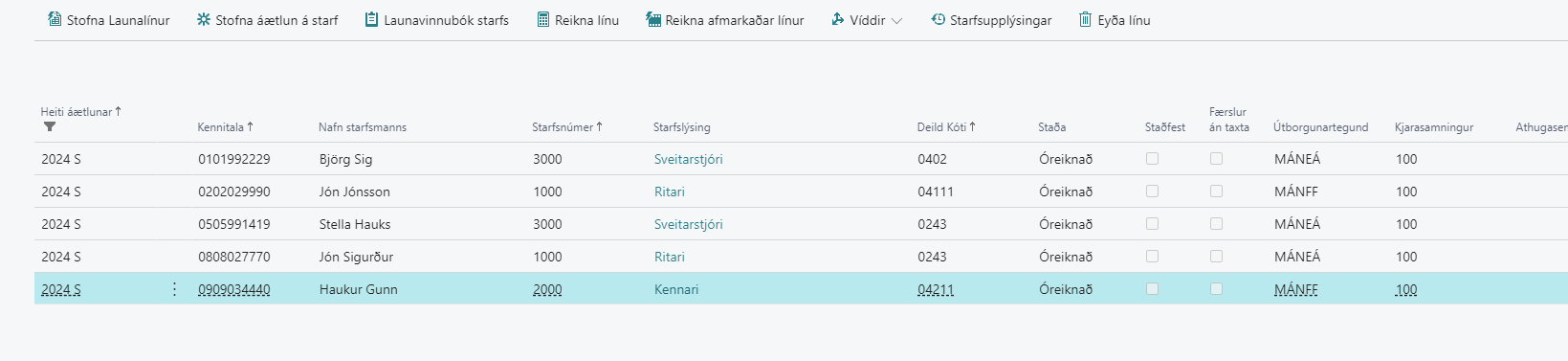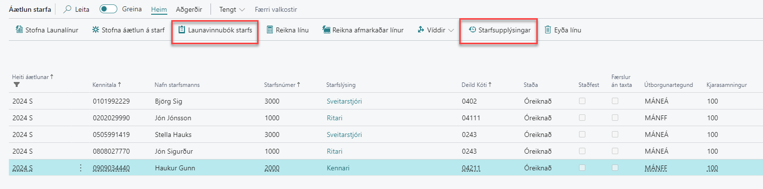 Öll störf í áætlun hafa launavinnubók og starfsupplýsingar.
