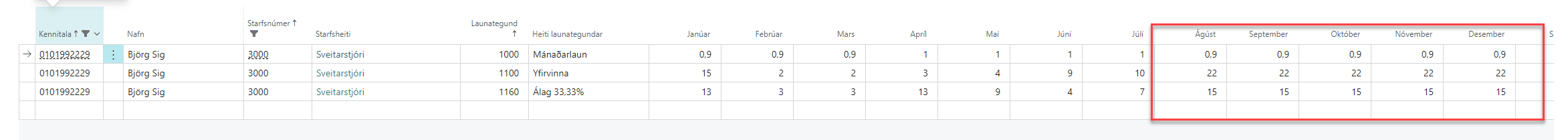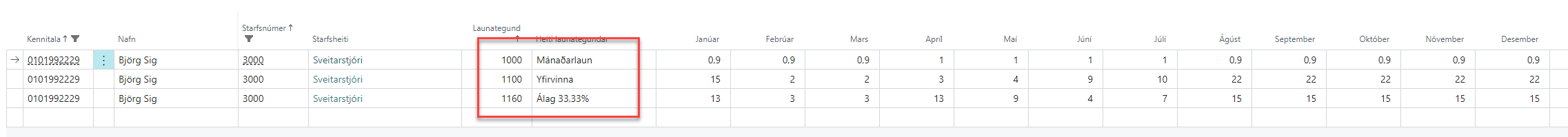 Þessi yfirlitsmynd sýnir alla starfsmenn í áætlunni, í hvaða deild þeir eru, útborgunarteg. o.fl. hægt er að bæta við fleiri dálkum, s.s. kjarasamningar o.fl.