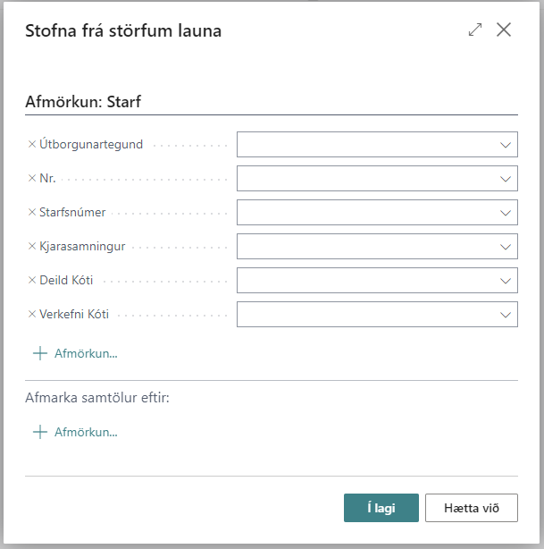 Ef valið er að stofna áætlun frá störfum, þá eru störf afrituð úr launakerfi (eftir ýmsum afmörkunum) en engar launafærslur afritaðar